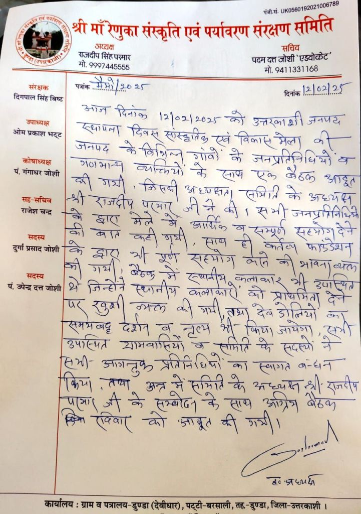 माँ रेणुका पर्यावरण संरक्षण संस्कृति समित डुंडा के द्धारा माँ रेणुका के प्रगाण मे मेला समिति के अध्यक्ष राजदीप सिहं परमार की अध्यक्षता मे 24 फरवरी2025को आयोजित होने वाले जनपद स्थापना दिवस की तैयारी को लेकर बैठक की गयी।