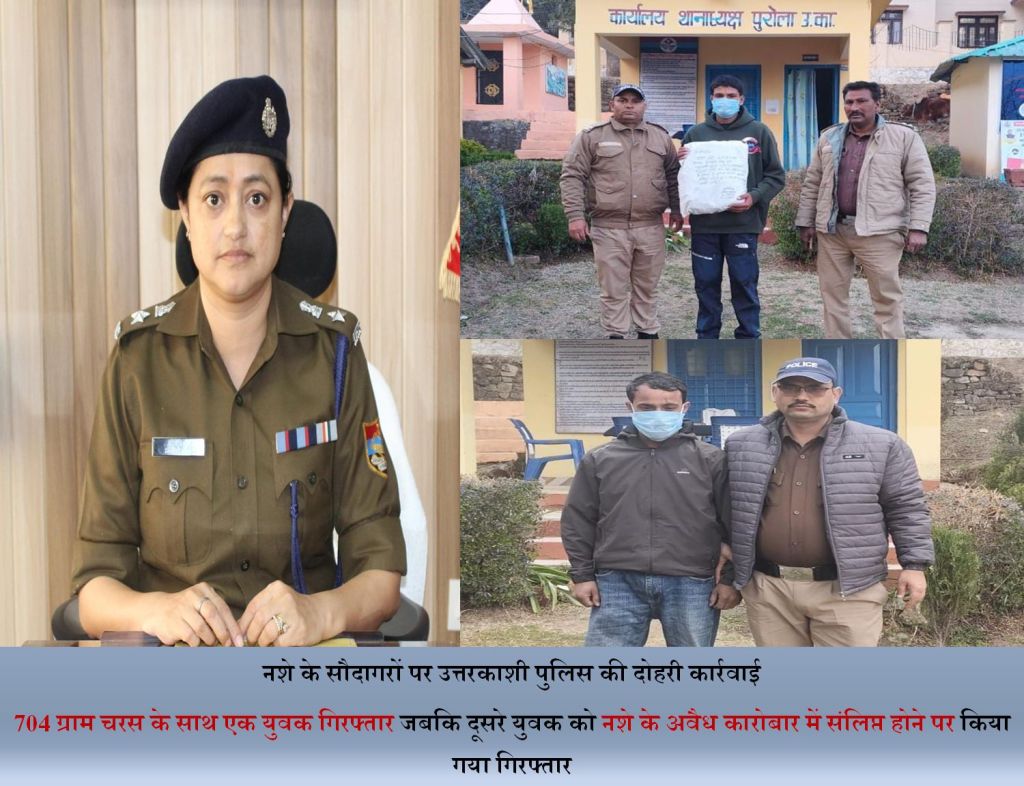 इसी क्रम में कल थाना पुरोला पुलिस द्वारा नशा तस्करों पर दोहरी कार्रवाई करते हुये दो युवकों को गिरफ्तार किया गया है।जिनमें एक युवक के कब्जे से 704 ग्राम अवैध चरस बरामद की गयी जबकि दूसरा युवक थाना पुरोला पर पूर्व में पंजीकृत NDPS Act के प्रकरण में संलिप्त है।