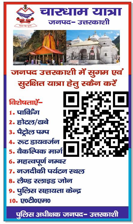 चारधाम यात्रा 2025 के सरल, सुगम एवं सुरक्षित संचालन के क्रम में पुलिस अधीक्षक उत्तरकाशी श्रीमती सरिता डोबाल के नेतृत्व में उत्तरकाशी पुलिस इस बार श्रद्धालुओं की सहायता हेतु एक नई पहल शुरु की गयी है, जिसमें पुलिस द्वारा एक क्यूआर कोड तैयार किया गया है।