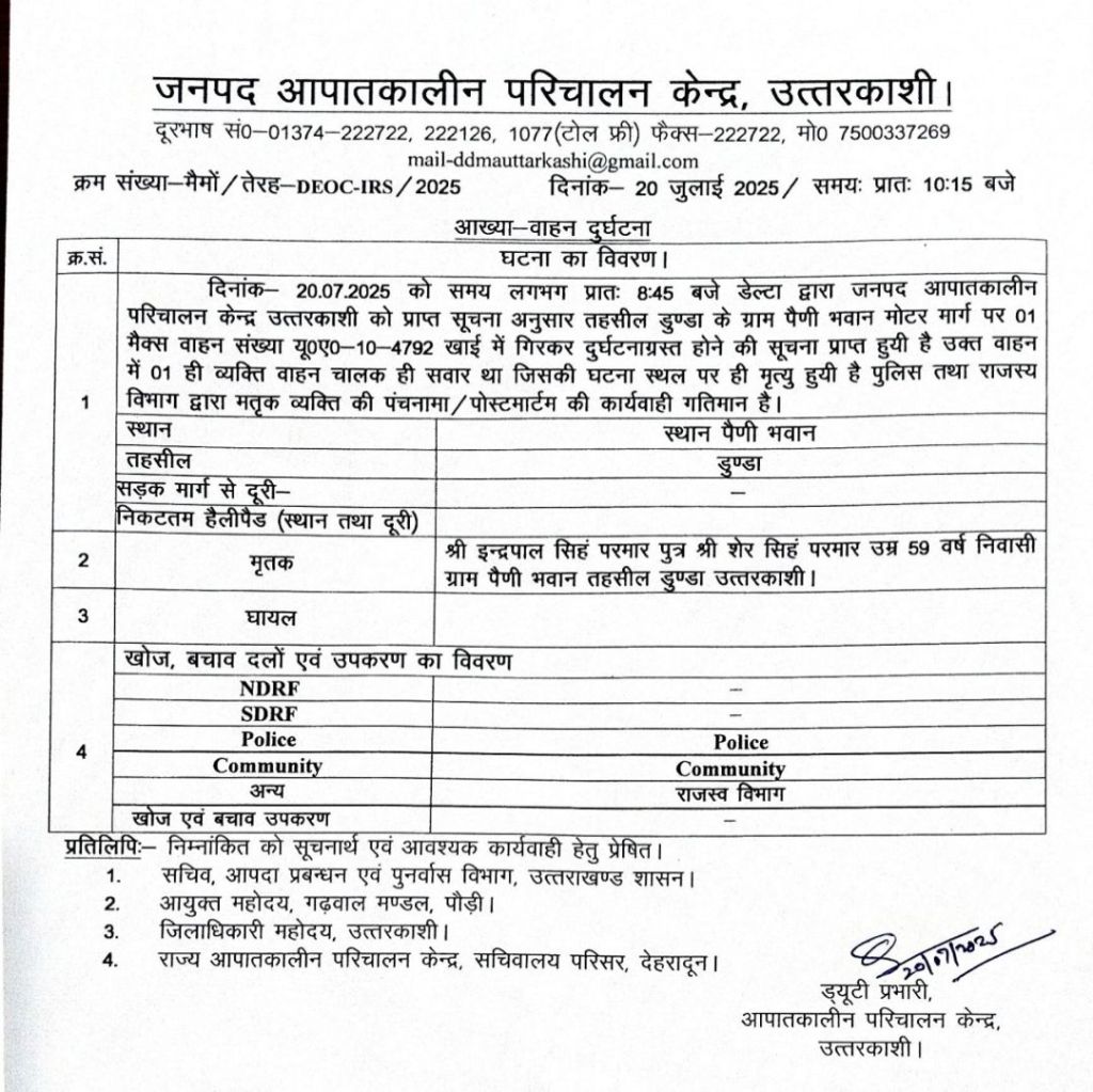 जनपद आपातकालीन परिचालन केंद्र उत्तरकाशी की सुचना अनुसार समय लगभग 8:45 पर डुंडा पैणी भवान के पास मैक्स वाहन संख्या यूके 10 4792 खाई गिरकर दुर्घटनाग्रस्त हो गया है।