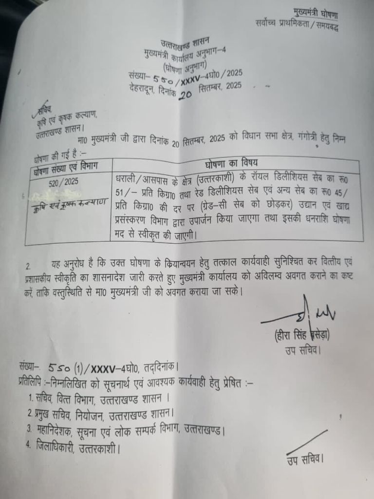मुख्यमंत्री पुष्कर सिंह धामी ने उत्तरकाशी जिले के आपदा प्रभावित धराली गांव एवं आसपास के क्षेत्रों के सेब उत्पादकों के हित में महत्वपूर्ण घोषणा की है। उन्होंने कहा कि सरकार सीधे किसानों से सेब की खरीद करेगी।