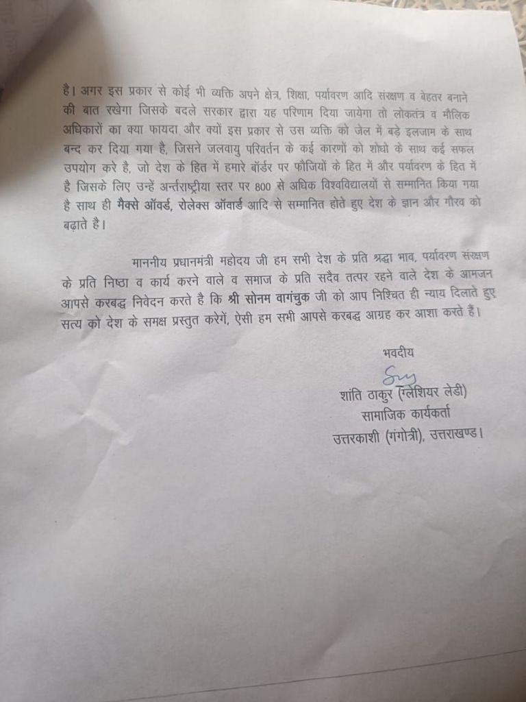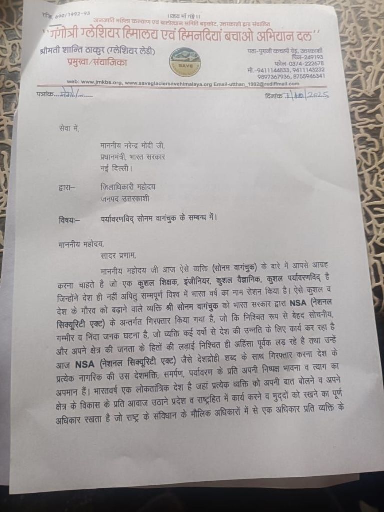 उत्तरकाशी जिले के सामाजिक और पर्यावरण संगठन ‘गांगोत्री ग्लेशियर हिमालय एवं हिमदियां बचाओ अभियान दल’ ने भारत के प्रधानमंत्री को पत्र लिखकर पर्यावरणविद् सोनम वांगचुक की हालिया गिरफ्तारी पर गहरी चिंता व्यक्त की है।संगठन ने पत्र में बताया कि लद्दाख के प्रसिद्ध पर्यावरण कार्यकर्ता सोनम वांगचुक को NSA (नेशनल सिक्योरिटी एक्ट) के तहत गिरफ्तार किया गया है।