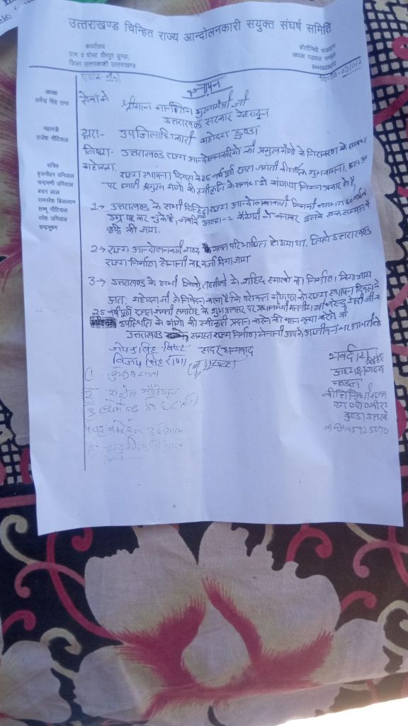 समिति के गढवाल मंडल अध्यक्ष कीर्ति निधि सजवाण ने कहा कि सभी चिन्हित राज्य आंदोलनकारियों को एक समान पेंशन दी जाए, साथ ही ‘राज्य आंदोलनकारी’ शब्द को बदलकर ‘उत्तराखंड राज्य निर्माण सेनानी’ दर्ज किया जाए।उन्होंने यह भी मांग रखी कि उत्तराखंड के सभी जिलों व तहसीलों में शहीद स्मारक का निर्माण किया जाए।
