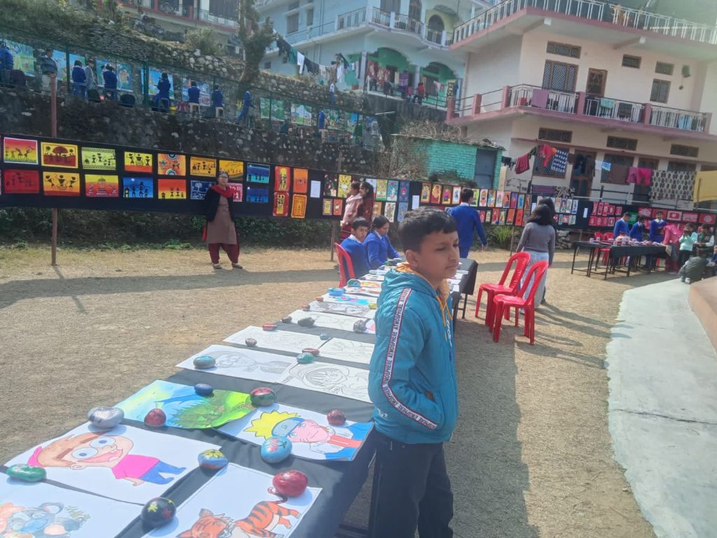 वही विधालय के प्रवेश द्वार पर ही छात्र औषधि पौधे लिये बैठे थे । आगंतुकों को पौधों के उपयोग के विषय में जानकारीयाँ उपलब्ध करवा रहे थे । छात्रों द्वारा बर्तनों पर सुंदर ऐपण कला का भी प्रदर्शन किया गया था । वही गंगा नदी के छोटे छोटे पत्थरों पर आकृति भी बनाकर सजीव रूप प्रदान किया गया था ।